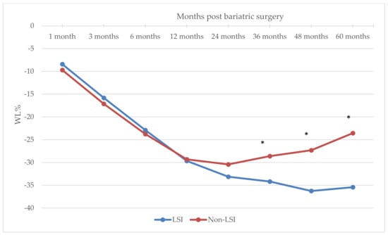 | Months Post-Bariatric | LSI n = 91 | Non-LSI n = 123 | Significance ¥ |