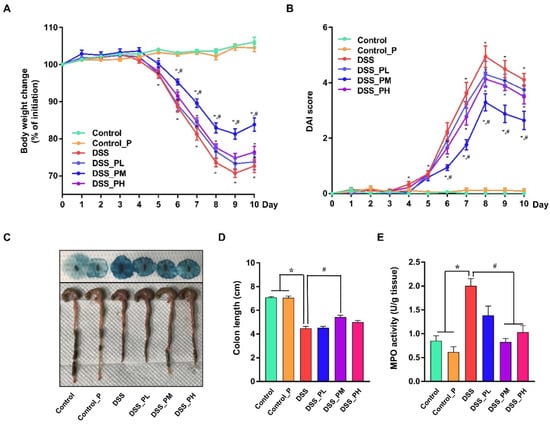 Pea albumin attenuated the severity of DSS-induced colitis. (A) Body weight change from day 0 to day 10 and the body weight loss relative to the baseline (day 0). (B) DAI score. The sum of the score recorded for weight loss (%), stool consistency, and fecal blood content was presented. (C) Representative images of bloody stool (up) and the colon length. (D) Statistical analysis of colon length. (E) MPO activity (U/g tissue). Data are shown as mean ± SEM. n = 9 per group. * p < 0.05 versus the control group. # p < 0.05 versus the DSS group. DAI, disease activity index; DSS, dextran sulfate sodium; MPO, myeloperoxidase; Control_P, 0.75 g/kg body weight pea albumin by oral gavage; DSS_PL, 2.0% w/v DSS in drinking water + 0.375 g/kg body weight pea albumin by oral gavage; DSS_PM, 2.0% w/v DSS in drinking water + 0.75 g/kg body weight pea albumin by oral gavage; DSS_PH group, 2.0% w/v DSS in drinking water + 1.5 g/kg body weight pea albumin by oral gavage.