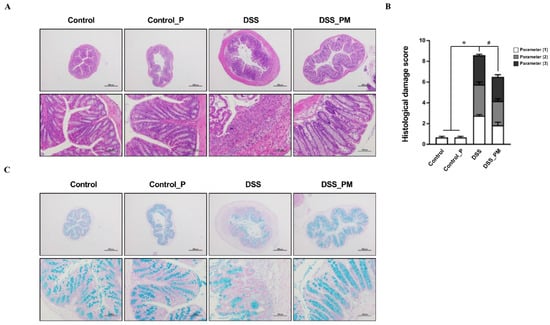 The following supporting information can be downloaded at: https://www.mdpi.com/article/10.3390/nu14173611/s1, Figure S1: Scheme of the animal experimental design. DSS, dextran sulfate sodium; Figure S2: Representative immunofluorescent staining image of CD4+, CD8+, CD11b+, and F4/80+ cells; Figure S3: The relative abundance of the gut microbiota between DSS group and DSS_PM group. Table S1: Parameters and criteria of histological damage evaluation; Table S2: Primer sequence for real-time PCR.