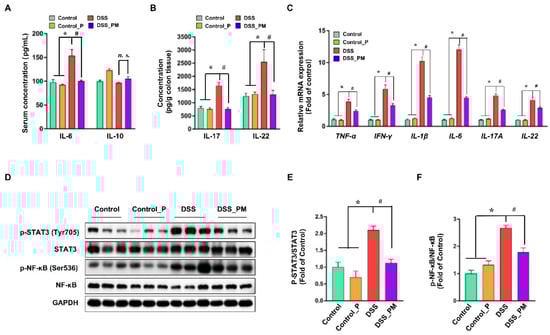 Pea albumin mitigated the induction of inflammatory response. (A) The serum protein level of IL-6 and IL-10. (B) The protein level of IL-17 and IL-22 in colon tissue. (C) Relative mRNA expression of TNF-α, IFN-γ, IL-1β, IL-6, IL-17A, and IL-22 in colon tissue. (D) Representative bands of p-STAT3 (Tyr705), STAT3, p-NF-κB (Ser536), NF-κB, and GAPDH in colonic tissue. (E,F) Statistical analysis of protein abundances in the colon. Data are shown as mean ± SEM. n = 9 per group. * p < 0.05 versus the control group. # p < 0.05 versus the DSS group. DSS, dextran sulfate sodium; Control_P, 0.75 g/kg body weight pea albumin by oral gavage; DSS_PM, 2.0% w/v DSS in drinking water + 0.75 g/kg body weight pea albumin by oral gavage; NF-κB, nuclear factor-κB; STAT3, signal transducer and activator of transcription 3.
