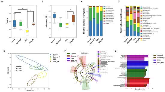 Pea albumin alleviated DSS-induced gut microbiota dysbiosis and reshaped the gut microbiota community. (A) Chao1 index. (B) Shannon_10 index. (C) Relative abundance of gut microbiota at the phylum level. (D) Relative abundance of gut microbiota at the genus level. (E) β-Diversity of bacteria community based on PCA and ANOSIM analysis. (F,G) Analysis of differences in the microbial taxa with a linear discriminant analysis score of 4.0 or greater from phylum to genus levels in gut microbiota communities under different treatments (LEfSe difference in dominant microorganisms under different treatments). Data are mean ± SEM, n = 6/group. * p < 0.05 versus the control group. # p < 0.05 versus the DSS group. DSS, dextran sulfate sodium; Control_P, 0.75 g/kg body weight pea albumin by oral gavage; DSS_PM, 2.0% w/v DSS in drinking water + 0.75 g/kg body weight pea albumin by oral gavage.