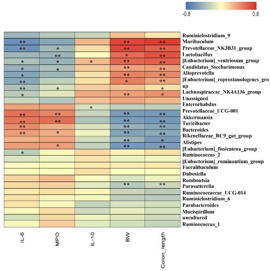 Spearman correlation between gut top 30 genera and growth development or serum biochemical parameters. The red color denotes a positive correlation, whereas the blue color denotes a negative correlation. The intensity of the color is proportional to the strength of the Spearman correlation. Data are mean ± SEM, n = 6/group. *, ** indicate a significant different. DSS, dextran sulfate sodium; MPO, myeloperoxidase; BW, body weight.