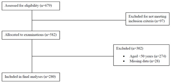 Data from 280 participants (50.7% male) aged 50–91 years were included in the analyses (Figure 1). The participants’ characteristics are described in Table 1. In total, 125 participants (50.4% male) had an ideal cardiovascular health score, 155 participants (51.0% male) had an intermediate cardiovascular health score, and none of the participants had a poor cardiovascular health score.