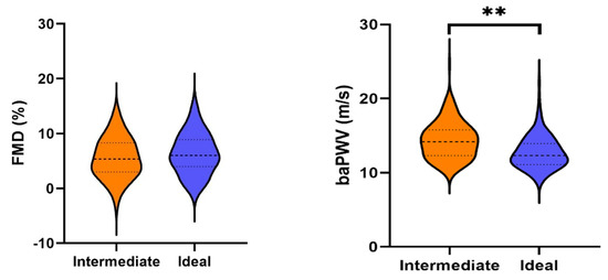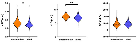 Violin plots of the arterial properties, divided into intermediate and ideal health scores. Legend: baPWV, pulse wave velocity; cIMT, carotid intima–media thickness; cLD, carotid lumen diameter; DC, distensibility coefficient; FMD, flow-mediated dilation. * indicates p < 0.05, ** indicates p < 0.01.