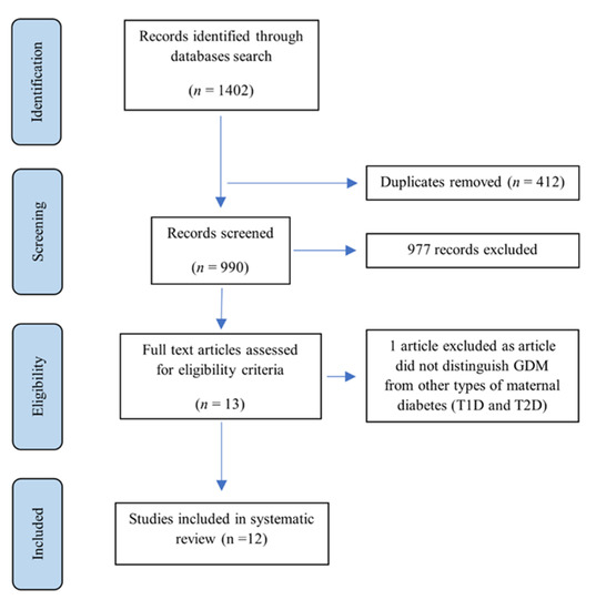 A total of 1402 articles were identified based on the search strategy. After removing duplicates (n = 412), 990 titles/abstracts were screened for eligibility. Of these, 13 articles were eligible for a full-text assessment. One study was excluded as the sample included mothers with different types of diabetes (Type 1 diabetes (T1D), T2D, and GDM), and the HM analytical method was not reported. In total, 12 studies were included in the systematic review. The PRISMA diagram of the systematic search and included studies are presented in Figure 1.