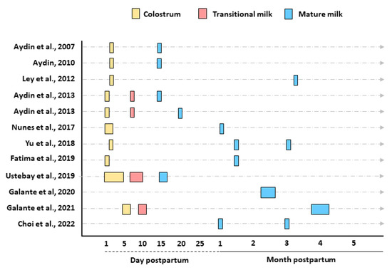 The times and categories of HM sample collection were reported as 1–5 days (colostrum), 6–14 days (transitional milk), and ≥15 days (mature milk) [1] (Figure 2). Colostrum and mature milk were collected in six studies [21,22,23,26,27,28]. Colostrum, transitional, and mature milk were collected in four studies [24,25,29,31], and only mature milk was collected in two studies [30,32].