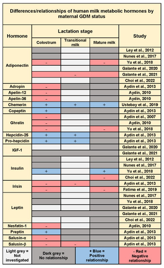 Four studies [22,24,25,29] have measured lower concentrations of HM hormones adropin, apelin-12 and apelin-36, nesfatin-1, and salusin α and β, and higher concentrations of chemerin, copeptin, hepcidin-25, pro-hepcidin, and preptin, in the colostrum of women that had GDM [22,24,25]; chemerin was the only hormone reported to be higher in mature milk of GDM mothers [29]. However, further investigation with a larger sample size and controlling for maternal BMI is needed.