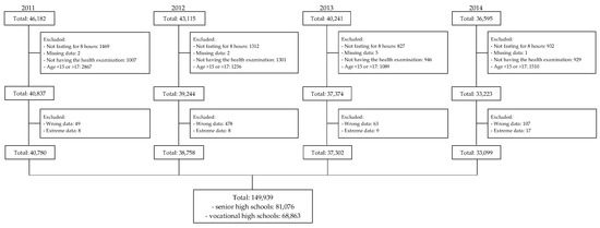 This cross-sectional study retrospectively collected anonymized data from all first-year high school students from Taipei City Hospital from 2011 to 2014. The data revealed that 46,182, 43,115, 40,241, and 36,595 students started senior and vocational high schools in Taipei City in 2011, 2012, 2013, and 2014, respectively. Each student’s BP, height, weight, WC, fasting blood glucose, total cholesterol, triglyceride, and HDL-c levels were recorded. We excluded students who were younger than 15 or older than 17 years old, did not fast for 8 h, had missing age or laboratory results, did not undergo the health examination, and had wrong or extreme height, weight, WC, or laboratory data. Ultimately, we included 81,076 and 68,863 first-year senior and vocational high school students, respectively (Figure 1). The study was approved by the Taipei City Hospital Research Ethics Committee (TCHIRB-1000908, TCHIRB-1010902, and TCHIRBB-10703112-E). All study procedures were conducted in accordance with the relevant guidelines and regulations of the Taipei City Hospital Research Ethics Committee.