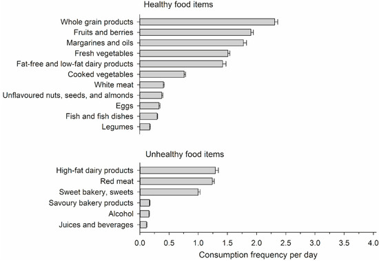 Mean daily consumption frequency for different groups of healthy and unhealthy food items. Whiskers show standard errors.
