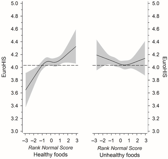 Relationships of EUROHIS-QOL 8-item Index mean as the function of rank-based normal scores of the consumption frequencies of healthy and unhealthy foods. The curves were derived from four-knot restricted cubic splines regression models. The models were adjusted for age, body mass index, education years, number of chronic diseases, smoking, and physical activity. Gray areas represent 95% confidence intervals.