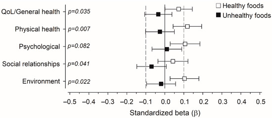 Relationships between consumption of (healthy and unhealthy) food items and different dimensions of quality of life (QoL) in a multivariate linear regression analysis with standardised regression coefficient beta (β). p-values are for the difference between the effect of healthy and unhealthy foods consumption. The models were adjusted for age, body mass index, education years, number of chronic diseases, smoking, and physical activity. Whiskers represent 95% confidence intervals.