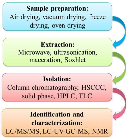 General scheme of sample preparation, extraction, isolation, identification, and characterization of phenolic compounds.
