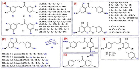 Some potential synthetic derivatives of phloretin: (A) Minsat et al. []; (B) Wang et al. []; (C) Pandey et al. []; (D) Shin et al. []; (E) Peerce et al. []; and (F) Diedrich [].