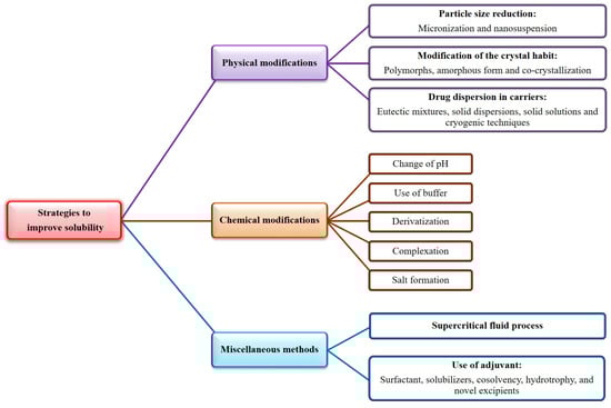 Phloretin [3-(4-hydroxy phenyl)-1-(2′,4′,6′-trihydroxy phenyl)-propen-1-one] is a crystalline phenolic ketone. The major contributors to the various biological effects of phloretin are two aromatic phenol rings A and B, hydroxyl groups, and a carbonyl group. Moreover, 2, 6-dihydroxyacetophenone is considered as a vital pharmacophore responsible for the antioxidant effect of phloretin, wherein the involvement of carbonyl and OH groups of ring A increases the activity. However, the displacement of one hydroxyl moiety by a sugar (like in phlorizin) decreases the activity relative to phloretin []. The physiochemical characteristics of phloretin are tabulated in Table 2. Unfortunately, phloretin’s low solubility in water and lipids leads to its poor absorption and bioavailability [,,]. Various ways used by researchers to increase drug solubility are depicted in Figure 3, which can be used to enhance the solubility of phloretin.