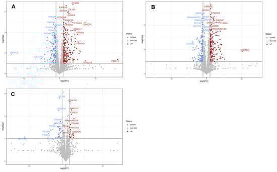 Differential expression of proteins between groups. Volcano plot showing the significance versus fold change in C vs. M (A), C vs. T (B), and M vs. T (C). Down-regulated proteins are shown in red, and up-regulated proteins are shown in blue.