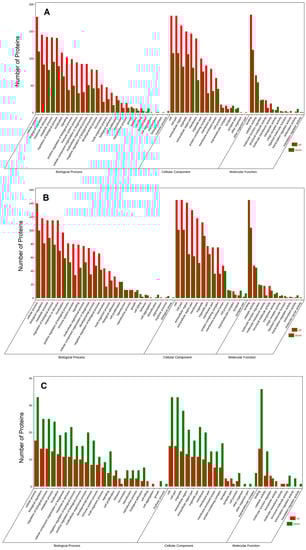 GO annotation of differentially expressed proteins in C vs. M (A), C vs. T (B), and M vs. T (C).