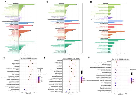 Analysis of differentially expressed proteins in C vs. M (A), C vs. T (B), and M vs. T (C) in KEGG pathway. Top 20 of KEGG enrichment pathway in C vs. M (D), C vs. T (E), and M vs. T (F). The size of the dot represents the number of differential proteins annotated to the pathway. The color of the dot represents the size of the P value.