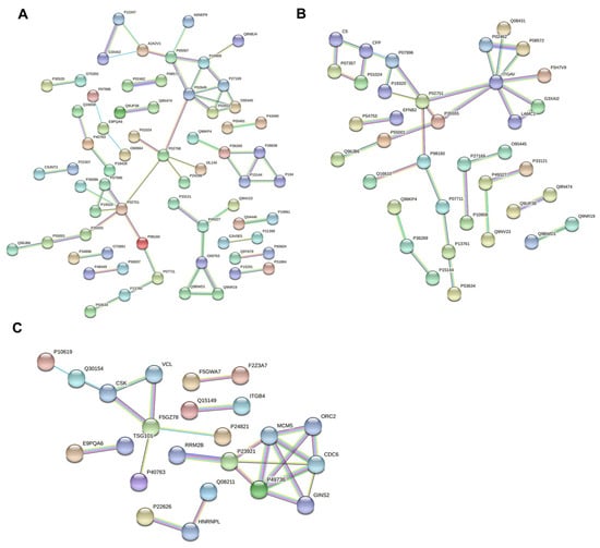 Protein–protein interaction network analysis of differentially expressed proteins in C vs. M (A), C vs. T (B), and M vs. T (C). Each node represents a protein, and each edge represents the interaction between proteins.