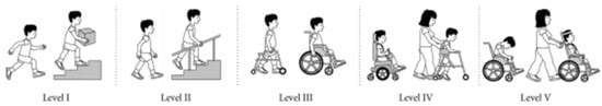 - Palisano, R.; Rosenbaum, P.; Walter, S.; Russell, D.; Wood, E.; Galuppi, B. Le système de classification de la fonction motrice globale de la paralysie cérébrale. Dev. Med. Child Neurol. 1997, 39, 214–223. [Google Scholar] [CrossRef]