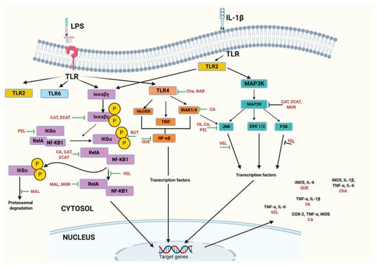- Xie, C.; Kang, J.; Li, Z.; Schauss, A.G.; Badger, T.M.; Nagarajan, S.; Wu, T.; Wu, X. The Açaí Flavonoid Velutin Is a Potent Anti-Inflammatory Agent: Blockade of LPS-Mediated TNF-α and IL-6 Production through Inhibiting NF-ΚB Activation and MAPK Pathway. J. Nutr. Biochem. 2012, 23, 1184–1191. [Google Scholar] [CrossRef] [PubMed]
