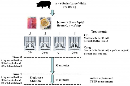 Six female Swiss Large White pigs housed at Agroscope (Institute for Livestock Sciences, Posieux, Switzerland) animal facilities were used. The animals were slaughtered at 171 (sd 2.8) d of age at the research station abattoir after being fasted for approximately 15 h, according to the Swiss Cantonal Committee procedures. For each pig, two jejunal samples starting from the third meter distal to the pylorus and two Ileal samples immediately before the ileocecal valve were mounted in Ussing chambers (Physiologic Instruments, San Diego, CA, USA). Each segment was bathed on its mucosal and serosal surfaces (exposed area 1.0 cm2) with the same corresponding KRB buffer. Specifically, each chamber was filled with 5 mL KRB buffer consisting of (in mmol/L) the following: mucosal—113.6 NaCl, 5.4 KCl, 0.2 HCl, 1.2 MgCl2, 1.2 CaCl2, 21 NaHCO3, 1.5 Na2HPO4, 2.0 Mannitol, 20 HEPES (4-(2-hydroxyethyl)-1-piperazineethanesulfonic acid), 0.01 indomethacin; serosal—113.6 NaCl, 5.4 KCl, 0.2 HCl, 1.2 MgCl2, 1.2 CaCl2, 21 NaHCO3, 1.5 Na2HPO4, 2.0 Mannitol, 7.0 HEPES, 10 Glucose, 6.0 Na-gluconate, 0.01 indomethacin. After the stabilisation period, the predigested γ-C (1.00 mg/mL) was added to the mucosal side and aliquots of 500 μL were collected on both mucosal and serosal sides. After 30 min, aliquots from each chamber were collected again. Immediately after, 10 mM D-glucose was added to the mucosal buffer and equimolar mannitol was added to the serosal side. The total active transport through the tissue was verified by monitoring the change in Isc (ΔIsc). The TEER was also measured at 2 min intervals under current clamped conditions. At the end of the experiment, forskolin (10 μM) was added to the serosal compartment to test cell viability. A scheme of the experiment is reported in Figure 1.