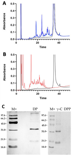 γ-C was hydrolysed to mimic gastrointestinal conditions by using a combination of pepsin and pancreatin digestions [33]. The products were analysed by RP-HPLC and SDS-PAGE. Figure 2A shows the chromatograms of the digestion with trypsin only (DP), whereas Figure 2B refers to the double digestion with pepsin and pancreatin (DPP). In the first case, some intact protein is still observable; whereas, following the double digestion, no intact protein was detectable. The size of the DPP digested peptides was such that they could not be retained by the used 15% acrylamide SDS-PAGE gel, where no bands are visible (Figure 2C).