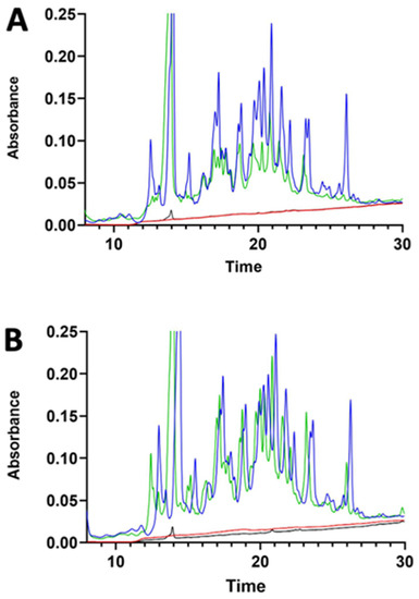RP-HPLC chromatograms of the jejunum (A) and ileum (B) apical and basolateral sides of Ussing chamber at the beginning of the experiment (blue and red lines, respectively) and after 30 min of incubation with γ-C50 sample (green and black lines, respectively). γ-C50: 0.50 mg/mL of intact γ-C.