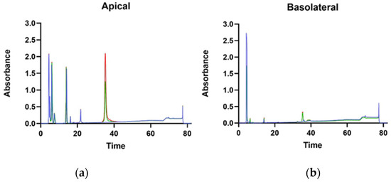 HPLC of supernatant from apical (a) and basolateral (b) chambers of transwell insert. Blue lines, red lines, and green lines indicate untreated, γ-C100 (1.00 mg/mL of γ-C), and γ-C50 (0.50 mg/mL of γ-C) samples, respectively.