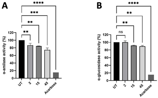 Effect of γ-C-derived peptides at 2, 15, and 45 min of digestion on α-amylase (A) and α-glucosidase (B) enzymes’ activity. Values are mean ± standard deviation of three independent experiments. **** p ≤ 0.0001, *** p ≤ 0.001, ** p ≤ 0.01. ns states for not significative.