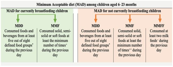 The outcome variable for this study is MAD. Operationally, MAD for currently breastfeeding children is defined as “receiving at least the MDD and MMF for their age during the previous day.” Similarly, MAD for children not currently breastfeeding is defined as “receiving at least the MDD and MMF for their age during the previous day as well as at least two milk feeds” []. The diagrammatic representation of the definition of MAD is presented in Figure 1.