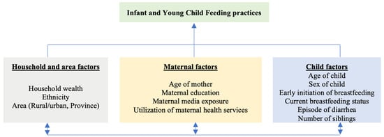 Explanatory variables for the study were selected based on the literature review and the availability of data in the MICS dataset. In addition to child and mother’s variables, contextual variables related to households and geographic areas that might affect child feeding practices were considered based on the conceptual framework of the study as illustrated in Figure 2.