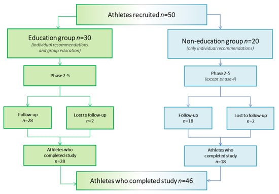 The athletes were randomly divided into two groups (Figure 1). The first was an education group (n = 30), in which individual recommendations and group education were provided. The members of the second group (n = 20) only received individual recommendations. Forty-six participants (n = 28 in the education group, n = 18 in the other group) were enrolled in a follow-up study after 17 weeks.