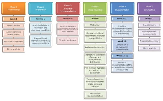 - Afterwards, a group nutritional education workshop was conducted, which included a 7-part program consisting of sections on motivation, nutritional recommendations for young athletes, peri-exercise nutrition and hydration, supplementation, as well as common nutritional mistakes and improper eating habits. In addition, participants were instructed in how to calculate energy requirements and macronutrient distribution in relation to the training period.