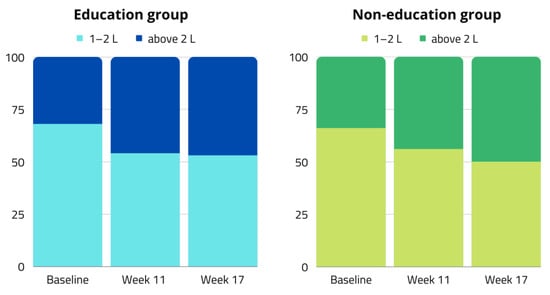 An increase in daily water intake was observed during the control phases in weeks 11 and 17 (Figure 3). Initially, in both groups, consumption of more than two liters of water per day was reported by in 33% of the study subjects. By the last follow-up visit, the percentage had increased by more than 15%.