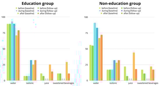 The most frequently drank peri-workout liquids, apart from water, were isotonics, fruit juices, and sweetened non-carbonated beverages (Figure 4). Less frequently chosen were diluted syrups, flavored waters, sweetened carbonated beverages and energy drinks, and their consumption was further substantially reduced during the study period.