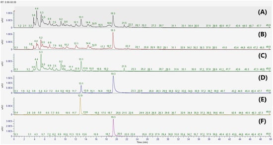 HPLC chromatograms of (A) a botanical mixture of 30% EtOH extracts from the leaves of Inula japonica and Potentilla chinensis, (B) 30% EtOH extracts of I. japonica Thunb, (C) 30% EtOH extracts of P. chinensis Ser., and (D–F) standard solutions at 280 nm. Apigenin 7-O-β-d-glucuronide and 2,3,4,5-tetracaffeoyl-d-glucaric acid were detected at Rt 13.1 and 19.3 min, respectively. Calibration standard solutions: (D) A mixture of apigenin 7-O-β-d-glucuronide and 2,3,4,5-tetracaffeoyl-d-glucaric acid, (E) apigenin 7-O-β-d-glucuronide, and (F) 2,3,4,5-tetracaffeoyl-d-glucaric acid.