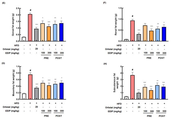 Effect of EEIP on body weight and body fat in HFD-fed obese mice. The pre−administration group was administered EEIP from the 1st week, and the post-administration group was administered EEIP from the 10th week. (A) Weekly change in body weight and (B) the final body weight. (C) The fat distribution, presented with a radiography image, and (D) the calculated values of fat in the tissue are measured using DXA. (E) Gonad, (F) renal, (G) mesentery, and (H) subcutaneous fat weight. Values are represented as the mean ± SEM. # p < 0.05 vs. normal diet control group; * p < 0.05, ** p < 0.01, and *** p < 0.001 vs. HFD group.