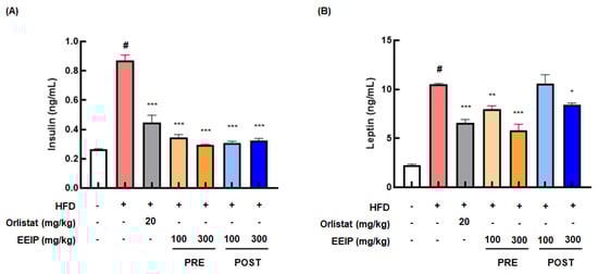 Effect of EEIP on the plasma level of insulin and leptin in HFD−fed obese mice. EEIP modulates plasma levels of (A) insulin and (B) leptin. Values are represented as the mean ± SEM. # p < 0.05 vs. normal diet control group; * p < 0.05, ** p < 0.01, and *** p < 0.001 vs. HFD group.