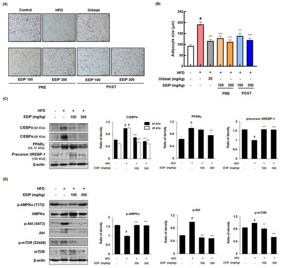 As the adipose tissue grows by two processes, hypertrophy and hyperplasia [28], we analyzed the effect of EEIP on the adipocyte hypertrophy of subcutaneous fat using H&E staining. As shown in Figure 6A,B, the HFD group showed an increase in the adipocyte size compared to the control groups (92.28 ± 13.87 μm at the control group vs. 192.2 ± 25.00 μm HFD group, p < 0.05); however, EEIP pre- or post-administration decreased the adipocyte size (192.2 ± 25.00 μm at the HFD group vs. 128.4 ± 24.05 μm at EEIP pre-administration 100 mg/kg, p < 0.001; 111.8 ± 20.15 μm at EEIP pre-administration 300 mg/kg, p < 0.001; 138.6 ± 26.68 μm at the EEIP post-administration 100 mg/kg group, p < 0.001; 120.0 ± 19.25 μm at the EEIP post-administration 300 mg/kg group, p < 0.001). In addition, Western blotting analysis was performed to clarify the effect of EEIP on the adipogenic transcription factors in the subcutaneous fat. As shown in Figure 6C, EEIP pre-administration restored the changes of C/EBPα and the precursor SREBP-1 protein expression and improved the protein level of PPARγ in subcutaneous fat from HFD-fed obese mice. In addition, both 100 and 300 mg/kg EEIP administration restored the reduced p-AMPK (T172) and elevated p-Akt (S273) and p-mTOR (S2448) levels in the subcutaneous fat of HFD-fed obese mice (Figure 6D), suggesting that EEIP alleviates adipose tissue hypertrophy by regulating adipogenic-related transcription and phosphorylation of the AMPK and Akt/mTOR pathways.