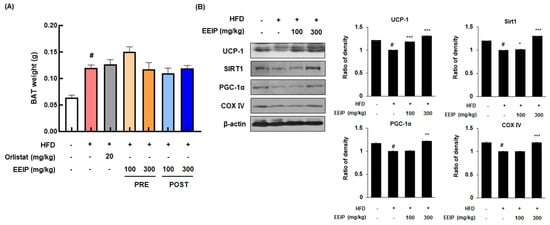 BAT is associated with energy expenditure through uncoupled respiration with high contents of mitochondria and heat production (thermogenesis) [30]. Although there was no significant change in the weight of BAT following EEIP treatment (Figure 8A), the protein expression of major energy consumption factors such as UCP-1, SIRT1, and PGC-1α in BAT was decreased in the HFD-fed mice, while EEIP administration significantly restored these protein expressions, similar to those observed in the control group, except for the EEIP 100 mg/kg group in PGC-1α (Figure 8B). Interestingly, COX IV, which plays a role in ATP synthesis, leading to the triggering of energy metabolism in mitochondria [31], was downregulated by HFD while EEIP administration at 300 mg/kg significantly ameliorated this reduction. These results indicate that EEIP dissipates amounts of chemical energy via an increase in mitochondrial activity of the BAT.
