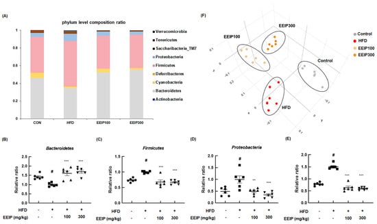 Effect of EEIP pre−administration on gut dysbiosis in HFD−fed obese mice (A) phyla level composition ratio (F) PCoA graph showing β diversity between groups. (B) Bacteriodetes, (C) Firmicutes, (D) Proteobacteria, and (E) Firmicutes/Bacteriodetes level quantifying graph. Values are represented as the mean ± SEM. # p < 0.05 vs. normal diet control group; ** p < 0.01, and *** p < 0.001 vs. HFD group.