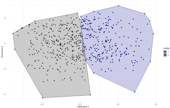 The elbow method indicated that two clusters would represent the 13 DBI-S items best. Therefore, we conducted the k-means clustering algorithm with two clusters, resulting in an average silhouette coefficient of M = 0.16. Figure 1 shows the partitioning clustering plot of the two clusters. Cluster 1 (n = 236) represents more non-adherent dietary behavior regarding the recommendations, whereas cluster 2 (n = 307) represents more adherent dietary behavior.