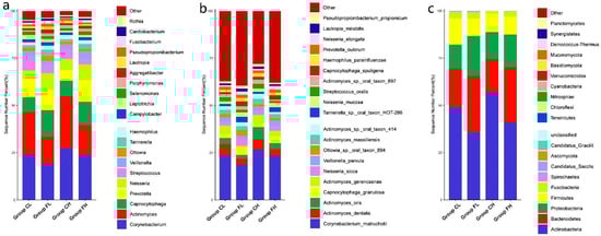 The bacterial distribution within the different groups was analyzed. We compared the relative abundance of the top 20 bacteria in the four groups with some interesting findings. Figure 2 shows the relative abundance of the phyla and species that were significantly higher in the FH and CL groups compared with the three other groups. As illustrated in Figure 2, at the phylum level, the CL group showed a higher relative abundance of Fusobacteria. At the genus level, the CL group was associated with a greater abundance of Lactobacillus. At the species level, in the CL group, Actinomyces gerencseriae and Actinomyces dentails had a higher relative abundance of the top 20 species covered. Streptococcus mutans, Candida albicans, Scardovia wiggsiae, and Propionibacterium acidifaciens were also more abundant in the CL group out of the top 20 species covered. However, eight species were more abundant in the FH group, including Capnocytophaga gingivalis and Porphyromonas gingivalis (the figure titled “Significant differences in relative abundance of plaque microbial taxa among the four groups by LEfSe analysis” was too large to place in the manuscript, so we were uploaded it as Supplemental Material Figure S2).