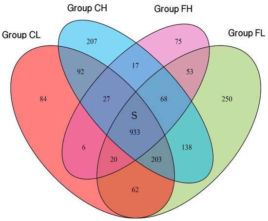 Venn diagram was used to illustrate the shared and unique taxa for the species level among groups. A total of 2235 species were identified in our study. The overlap region S indicates the microbiome shared in all samples among the four groups, and 933 species were detected in all of the four groups. There were 84, 207, 75 and 250 unique species detected in the CL, CH, FH, and FL groups, respectively (Figure 3).
