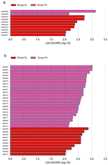 LEfSe analysis of the gene profiles showed enormous differences at the functional level of the groups. At the second level, enrichment in membrane transport was observed in the CL group compared with the other groups. At the third level, the synthesis and degradation of ketone bodies, the phosphotransferase system (PTS), carbapenem biosynthesis, quorum sensing, retrograde endocannabinoid signaling, basal transcription factors, chlorocyclohexane and chlorobenzene degradation, and the NOD-like receptor signaling pathway were enriched in the CL group, while lipopolysaccharide biosynthesis and isoquinoline alkaloid biosynthesis exhibited a higher level in the FH group (Figure 6a).