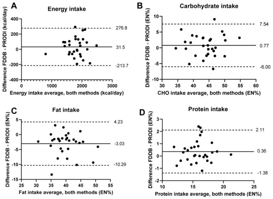 Repeated-measures Bland-Altman plots of the differences in intakes analyzed using the FDDB and PRODI tools against the mean values for the two methods for (A) energy, (B) carbohydrates, (C) fat, and (D) protein. The solid line indicates the mean difference, while the dashed lines indicate the 95% limits of agreement (LOAs) (1.96 SD) for nutrient intake. EN%, relative percentage energy intake of total macronutrient intake.