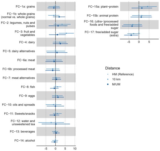 Figure 2 displays differences in food clusters between 10-km, HM, and M/UM runners, and further details about the regression results, including p-values are shown in Table 4. Assuming HM distance as the reference group, 10-km distance was a significant predicator of “fruit and vegetables” intake (i.e., FC-3) (p = 0.006), while M/UM distance was a significant predicator of “free/added sugar” consumption (i.e., FC-17) (p = 0.030). Age has been found to be a significant predictor of five food clusters, including “fruit and vegetables” (p = 0.003), “unprocessed meat” (p = 0.027), “processed meat” (p = 0.022), “eggs” (p = 0.040), and “plant protein” (p = 0.029).