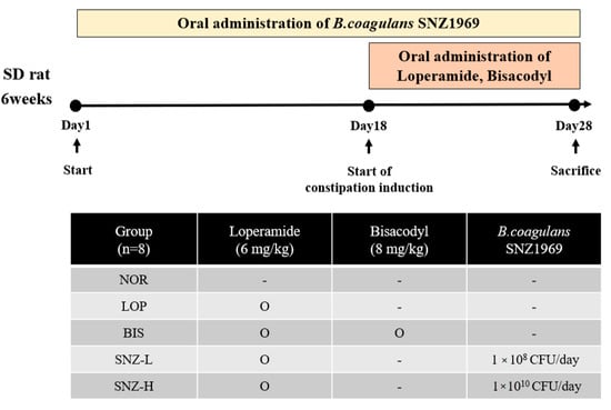 Experimental design. Experimental animals were five-week-old male SD rats. NOR: Normal group; LOP: Loperamide treated group; BIS: Loperamide and Bisacodyl 8 mg/kg treated group; SNZ-L: Loperamide and B. coagulans SNZ 1969 at 1 × 108 CFU/day treated group; SNZ-H: Loperamide and B. coagulans SNZ 1969 at 1 × 1010 CFU/day treated group.