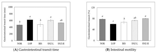 The intestinal transit time was defined as the difference between the start time of the carmine red mixed diet fed and the time when the first red stool appeared. The results of intestinal transit time on the fourth day after administration of loperamide are shown in Figure 3a. The intestinal transit time was significantly increased in the LOP group compared to that in the NOR group. The BIS group showed a significantly decreased intestinal transit time compared to the LOP group (p < 0.05). In the case of the SNZ-H group, the intestinal transit time showed a tendency to decrease compared to the LOP group, although the decrease was not statistically significant (p > 0.05).