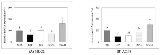 There were significant differences in the mRNA expression of Mucin 2 (MUC2) among groups (NOR, LOP, BIS, and SNZ-L groups). In the SNZ-H group, the mRNA expression of MUC2 was significantly increased compared to those in the other groups (Figure 5A) (all p < 0.05). The mRNA expression of Aquaporin 8 (AQP8) was significantly decreased in the LOP group compared to that in the NOR group but significantly increased in both SNZ-L and SNZ-H groups compared to that in the LOP group (Figure 5B) (all p < 0.05).